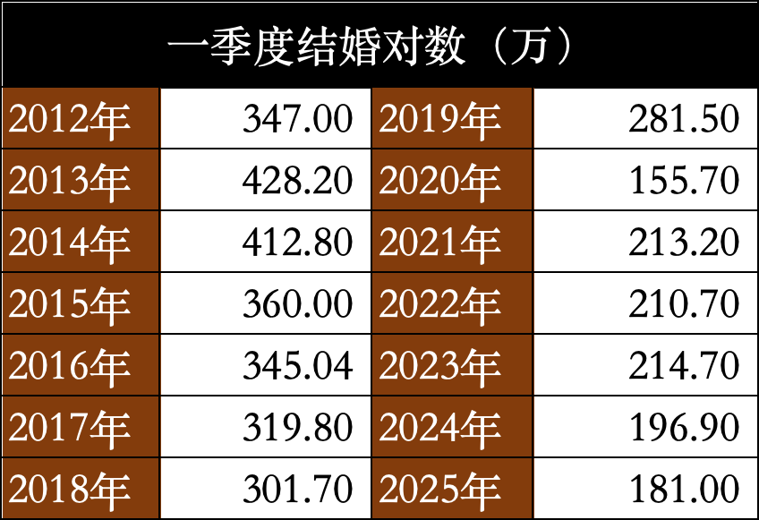 这周末官方披露了一季度的结婚人数181万对,同比下跌8%,而且181万这是除了2020年一季度之外的历史最低值,2020年一季度你们懂的,那个数据不正常,说白了一季度就是刷新史低了。