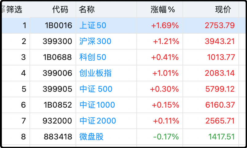 今天的行情有很强烈的偏向性,头部指数的表现明显强于小微盘股指数,这其中金融板块立大功了,保险大涨7%高居所有行业之首,证券涨3%,银行也涨了1.5%,另外像多元金融也涨了3.5%,这在平时并不多见。
