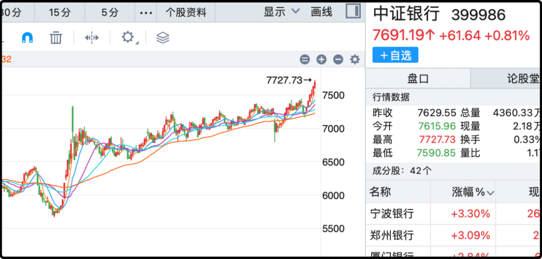 我贴个中证银行指数最近的走势,挺猛的,天天刷新高。