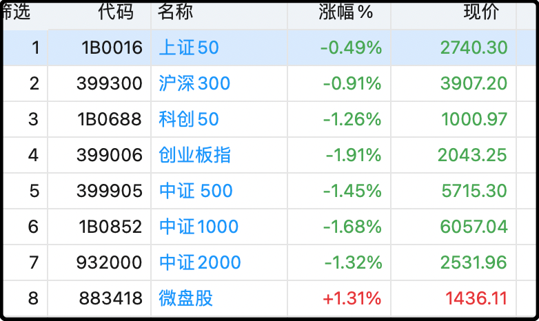 今天a股成交1.15万亿,又缩量了,中位数下跌0.97%,刚涨几天又跌了回去。市场风格和昨天形成了反差对比,昨天是头部公司上涨,小微下跌回调,今天几个大盘指数里只有微盘股上涨1.3%,其它的都在跌。