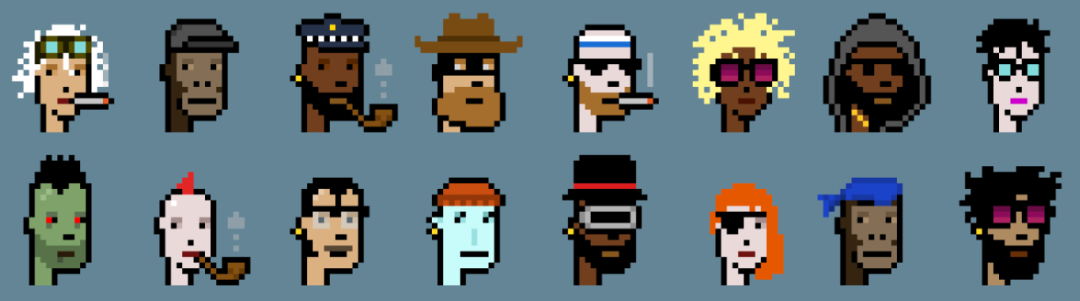还有前几年区块链爆火的NFT,最贵的CryptoPunks系列,你们可能在网上也见到过,就是一些像素风的头像,如下,这玩意最贵的的时候要300多万人民币一个,现在地板价也要80多万。